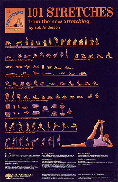 | A large and beautiful four-color poster, laminated, with 2 brass grommets for hanging. Here are 101 stretches from Stretching, by Bob Anderson.