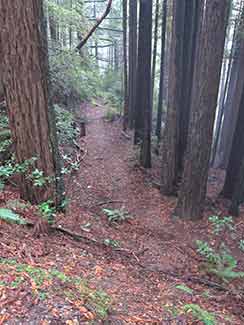 Rainy Sunday, sunny Monday It's a sunny Monday morning. We had our first (bit of) rain yesterday in 4 months. Today is bright and clear with blue skies. Yesterday after the rain, I took off on my new mountain bike with air shocks and disc brakes -- such a pleasure to ride. Each time I get on it, I just go, Oh yeah! I hit the road potholes at top speed and it's like riding on a cushion of air. I headed up the mountain road, and it was alternately sunny and misty. The ferns were happy and glistening.