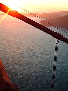 I climb through the hatch cover, and step into the warm night, the sun getting ready to set, and I’m 700' above the water, it has to be one of the greatest thrills in my life. I’m surprised to feel perfectly safe; there’s a railing. I’m not crazy about heights, but this feels OK. It’s a unique vantage point. San Francisco: Baker Beach, the Presidio, downtown, the ocean on one side. Marin: Angel Island, the little yacht harbor, the brown hills on the other side.