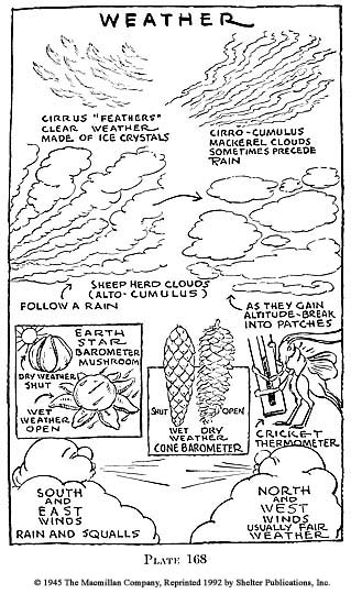 When the cirrus clouds, the wispy curls high in the air, move swiftly, watch out for rain (Plate 168). A variation of the cirrus clouds is the so-called mackerel sky. This also tells of storms to come. Clouds moving in different directions at various levels foretell rain. Smoke rising and then falling again, indicates rain. Here are a few weather proverbs worth remembering: