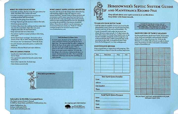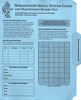 On the front of the folder are places to write down the names of local pumpers, record dates the system was inspected, and to plot the location of the septic tank in relation to the house. On the back of the folder is a place for the district or agency to place an imprint (or use a sticker) with their name, address, and phone number.