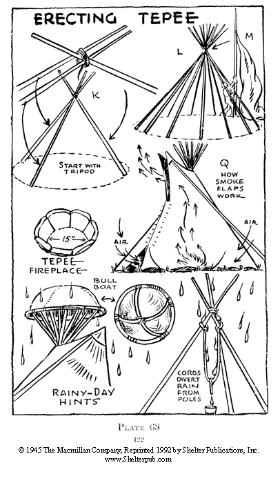 Twelve or more poles are needed for the tepee framework (Plate 68). These should be straight and smooth, and at least 3 feet longer than the width of the cover. If the tepee is 15 feet wide, the poles should be at least 18 feet long.