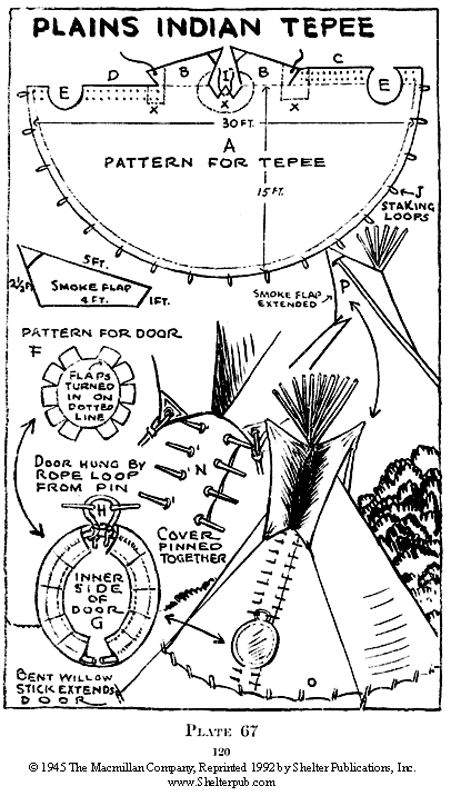 The tepee of the Plains Indians is a fine dwelling, where poles are available and a permanent camp is in order. It is a roomy structure in which a fire may be built, and is comfortable in extremes of heat or cold. The pattern of the tepee (Plate 67) is cut in the shape of a halfcircle (A), twice as long as it is wide, with 2 smoke flaps (B) near the center of the pattern. Fifteen by 30 feet is a good size. If the tepee is smaller, it is difficult to keep it free of smoke. Eight-ounce canvas is satisfactory for the cover.