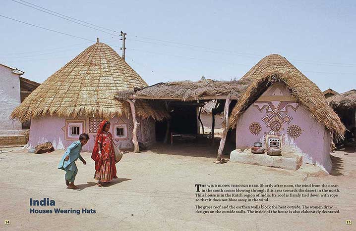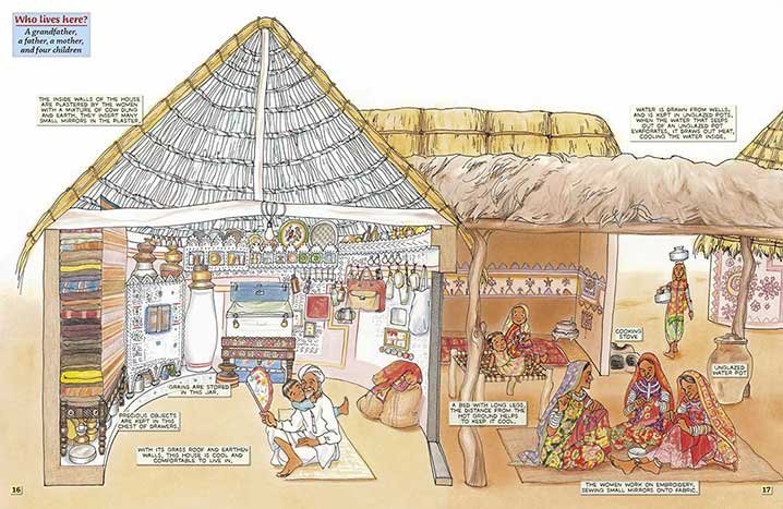 The grass roof and the earthen walls block the heat outside. The women draw designs on the outside walls. The inside of the house is also elaborately decorated.
