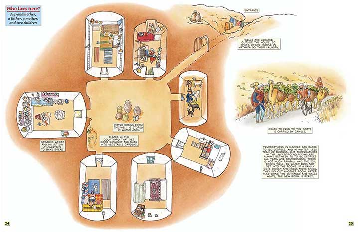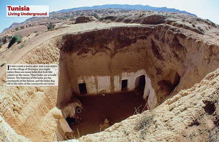 | If you climb a small hill and look down at the village of Matmata, you might notice there are many holes that look like craters on the moon. These holes are actually houses. The bottoms of the holes are the courtyards of the houses, and the holes dug off to the sides of the courtyards are rooms. |
