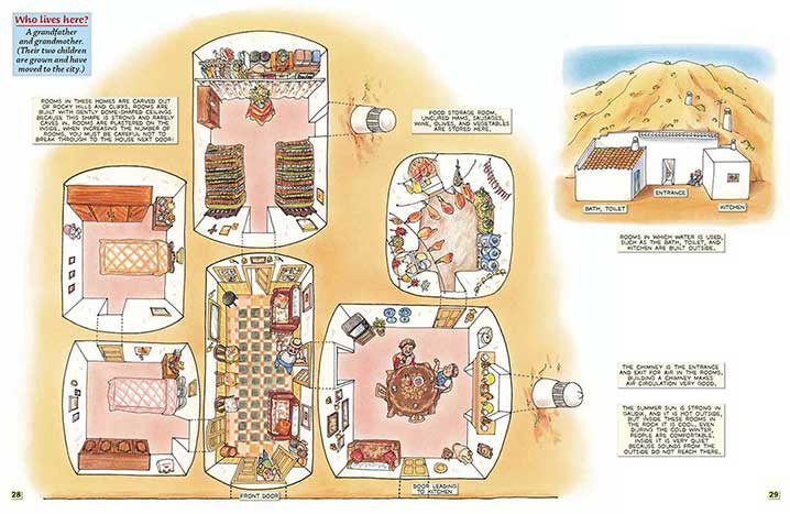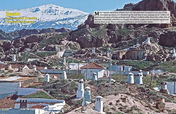 | Many white chimneys spring out of the ground! I wanted to see one of the chimneys up closer, so I climbed up the hill that it was coming out of. I felt as if my footsteps were echoing underground. When I walked softly down the other side of the hill, I found the entrance to a house. An elderly couple saw me wandering around and invited me in. These underground houses are in Gaudix, Spain. |