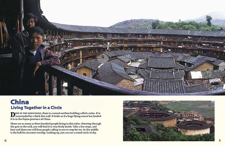 | Deep in the mountains, there is a round earthen building called a tulou. It is surrounded by a thick dirt wall. It looks as if a huge flying saucer has landed. It is in the Fujian province of China.